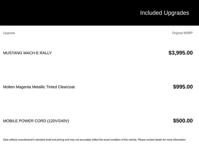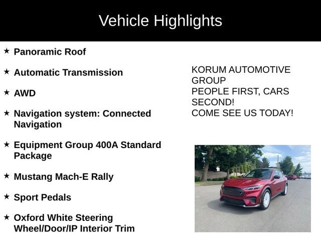 Panoramic Roof, Automatic Transmission, AWD, Mustang Mach-E GT, 4D Sport Utility, Electric Motor, Single-Speed Automatic, AWD, Molten Magenta Metallic Tinted Clearcoat, Black Painted Steel Roof, Door, Wheel, Roof & Bumper Trim, Equipment Group 400A Standard Package, Ford Performance Front Seats, Hood & Decklid Stripes, Mach-E Rally Door Graphics, Mustang Mach-E GT Performance Upgrade, Mustang Mach-E Rally, Navigation system: Connected Navigation, Oxford White Steering Wheel/Door/IP Interior Trim, Rallycross-Tuned MagneRide Damping System, RallySport Drive Mode, Sport Pedals, Unique Front Splitter in Dark Carbonized Gray, Unique Grille Shield in Dark Carbonized Gray, Unique Raised Rear Spoiler in Dark Carbonized Gray, Wheels: 19 High Gloss Oxford White.