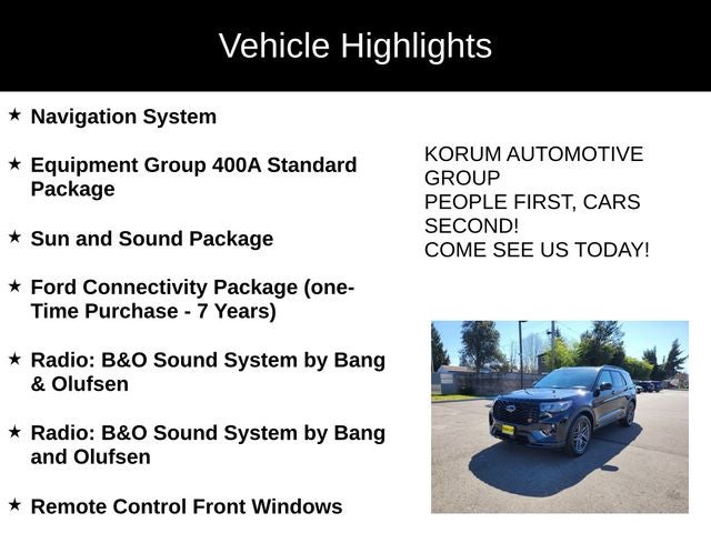 Recent Arrival! Explorer ST, 4D Sport Utility, 3.0L EcoBoost V6, 10-Speed Automatic, 4WD, Agate Black Metallic, Equipment Group 400A Standard Package, Ford Connectivity Package (one-Time Purchase - 7 Years), Heated/Ventilated Miko Suede Captain's Chairs, Multicontour Seats with Front Active Motion, Navigation System, Panoramic Fixed Glass Roof with Power Shade, Radio: B&O Sound System by Bang & Olufsen, Radio: B&O Sound System by Bang and Olufsen, Remote Control Front Windows, Sun and Sound Package, Wheels: 21 Magnetite-Painted Aluminum.